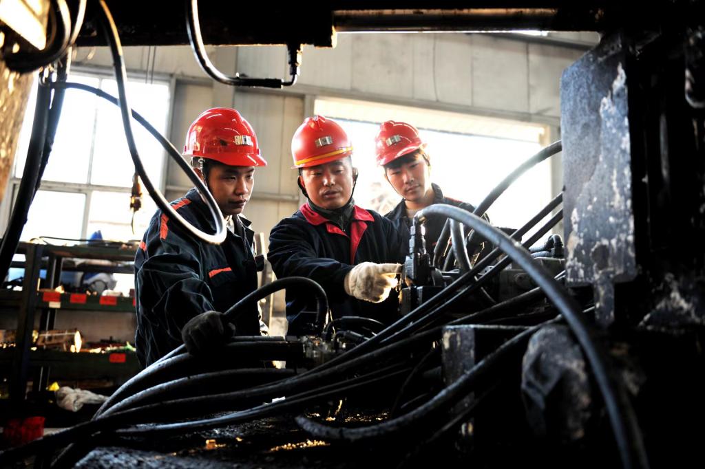 杲志(中間)在為職工講解鉆機維修知識