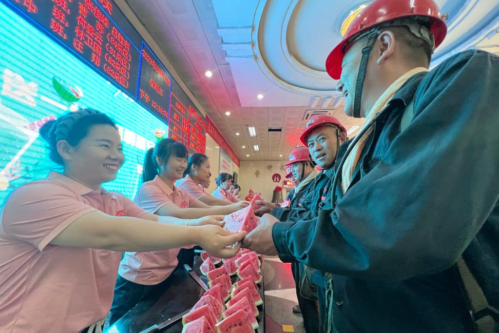 協(xié)安員在井口大廳為升、入井的職工師傅們送上西瓜和茶水,叮囑大家做好防暑降溫,牢記安全生產(chǎn),把夏日清涼送到職工的心坎上。職工們紛紛表示,一定牢記囑托,時刻注意安全,認真履職盡責,確保安全生產(chǎn)。(撰稿:徐燕萍 呂嬋娟 審核:鄧為)