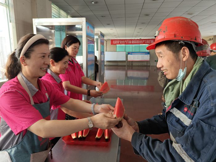 近日,在祁南礦井口大廳,該礦協(xié)安員大聲吆喝著剛升井的職工吃瓜解暑,一群高溫下堅守崗位的職工趁著交接班的空檔,手拿大西瓜,大家你一言我一語地說著話,無不稱贊著送清涼這場“及時雨”。