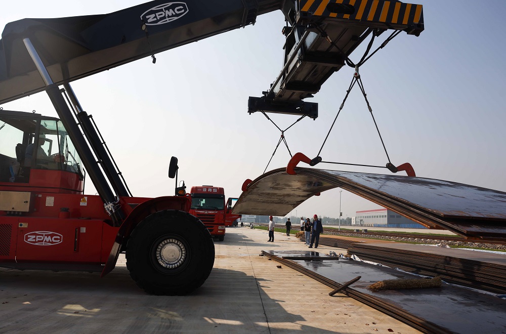 10月11日上午,淮北零碳智慧物流產(chǎn)業(yè)園大宗物資作業(yè)現(xiàn)場(chǎng),正面吊運(yùn)起重機(jī)正開足馬力,將600噸16至25毫米厚度的大塊鋼板一次性吊起6至8塊,裝到排成長(zhǎng)隊(duì)的6軸大貨車上。