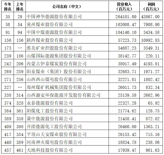 2019年7月10日,財富中文網發布了最新的《財富》中國500強排行榜。煤炭行業有18家公司入圍,分別為:
