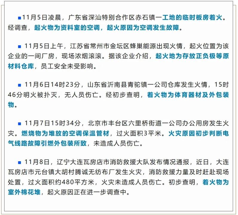 隨著冬日到來,氣候寒冷、干燥、多風,傳統節日、大型活動集中,用火用電用氣量增加,火災呈現易發多發之勢。根據有關火災數據統計,一年中冬季火災起數占比最大,特別是第四季度生產、經營、建設活動頻繁,火災形勢嚴峻復雜。進入11月以來,多地建筑工地、工廠倉庫等生產經營場所接連發生火災,值得高度警惕!
